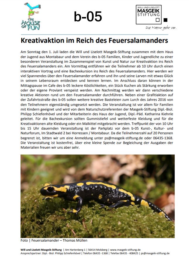 Ankündigung der Masgeik Stiftung: Kreativaktion im Reich des Feuersalamanders