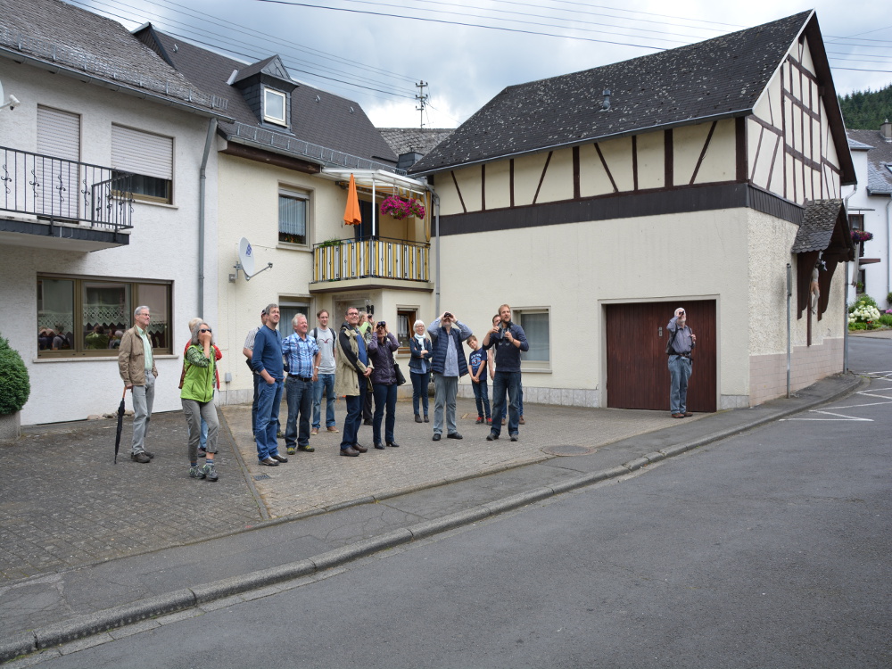 Unter der Führung von Schiefenhövel folgte noch eine Exkursion durch die Ortsgemeinde. In Arzbach wurden in der Vergangenheit viele Kunstnester, insgesamt circa 130, an den Häusern angebracht, sodass einige Schwalben beim Anflug der Nester und bei der Fütterung des Nachwuchses beobachtet werden konnten. Zum Abschluss der Exkursion ging es noch in die Halle der Firma Modigell-Scherer. Dort werden, obwohl gerade Reinigungsmaßnahmen erhebliche Arbeit verursachen, seit Jahren die dort brütenden Rauchschwalben unterstützt. Eine beispielhaftes Vorbild also im Schwalbenschutz und nicht zuletzt ein Grund warum sich die heimischen Vögel in Arzbach wohl fühlen.